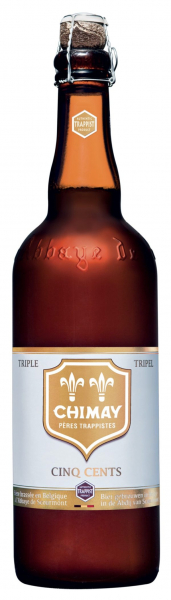 Birra Chimay Cinq Cent cl 75 con tubo origine Belga, trappista stile Tripel gusto robusto ed intenso con equilibrio dolce-amaro ottima con pasta, carni bianche, carni rosse, pesce, formaggi stagionati, funghi