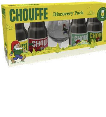 Confezione 4 Birre Chouffe cl 33 e bicchiere nell'originale pack Decouverte con bicchiere nei tipi bionda leggera alla frutta Ipa e bionda classica un pack degustazione veramente completo