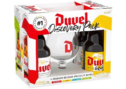Confezione 4 birre Duvel cl 33 Discovery Pack nei tipi Original, Triple Hop Citra, Triple Hop Cashmere IPA e Belgian Blond da gradi 6,6 un mix di gusto inimitabile