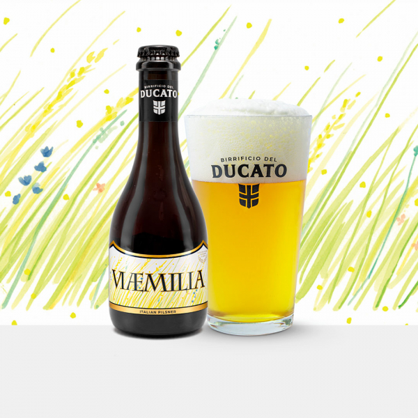 Birrificio del Ducato Via Emilia cl 33 la pilsner italiana più premiata dal gusto dalle note floreali ed erbacee con una leggera sfumatura di miele d'acacia beverina si adatta ad antipasti , primi piatti e verdure