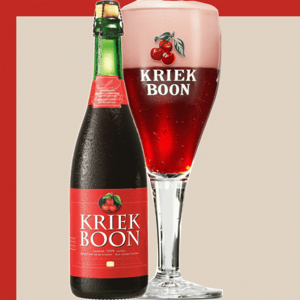 Birra Kriek Boon cl 375 belga di tipo lambic prodotta a fermentazione spontanea contiene solo ciliegie fresche gusto delicatamente dolce con fragranza di amarene e mandorle bevanda ideale per l'estate