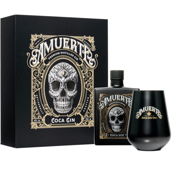Gin Amuerte Black cl 70 e 2 bicchieri gin prodotto da foglie di coca in combinazione con botanicals esotiche e sudamericane frutto del drago e pepe di sichuan grusto fruttato e agrumato con sottili sfumature erbacee