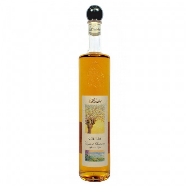 Grappa Giulia Distilleria Berta cl 70 di uve Chardonnay e Cortese affinata in botti di rovere di Slavonia per 10/12 mesi gusto morbido con sentori di vaniglia e frutta tropicale