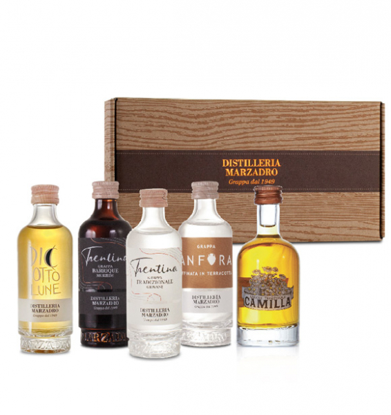 Set Degustazione 5 mignon Marzadro cl 5 collezione composta da la Trentina bianca tradizionale la Barrique l'Anfora grappa bianca Le Diciotto Lune ed il liquore Camilla