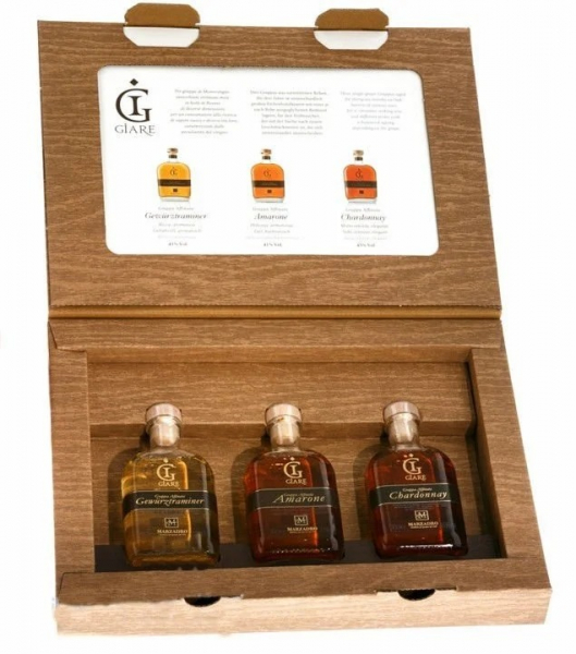Set Degustazione 3 Mignon Grappa Le Giare cl 10 nei tipi Amarone Chardonnay e Gewurztraminer