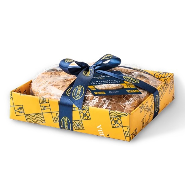 Schiacciata Antica Ricetta gr 500 l'aspetto è basso con glassa nella quale sono incastonate le mandorle a filetti. L’interno è soffice e ben lievitato e il sapore è quello lineare e pulito dei pochi e semplici ingredienti utilizzati