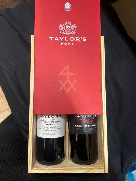 Confezione Legno 2 bottiglie Porto Taylor's Ruby e Select Reserve cl 75 una bottiglia di Porto giovane di buon corpo ed una bottiglia Tawny che invecchia almeno 3 anni in botti di quercia