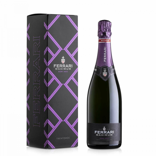 Spumante Ferrari Maximum Demi Sec cl 75 venti mesi di affinamento in bottiglia gusto amabile e dalla marcata rotondità con un piacevole fondo di frutta matura e sentori di pasticceria ottimo da dessert
